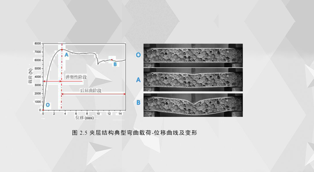 2.5是泡沫鋁夾層結(jié)構(gòu)彎曲試驗(yàn)典型的載荷-位移曲線(xiàn)和試件在三個(gè)特定位置的變形、破壞圖。根據(jù)載荷-位移曲線(xiàn)的初始拐點(diǎn)和變形、破壞程度,可將載荷-位移曲線(xiàn)分為兩個(gè)階段,兩個(gè)階段的臨界點(diǎn)位移對(duì)應(yīng)的載荷稱(chēng)為臨界失效模式的臨界載荷。第一階段為彈塑性階段,從O到A,此階段夾層結(jié)構(gòu)主要發(fā)生彈性變形,載荷與位移呈近似線(xiàn)性增長(zhǎng)關(guān)系;第二階段為初始拐點(diǎn)至最終破壞,稱(chēng)為后屈曲階段,此階段夾層結(jié)構(gòu)的局部或者整體發(fā)生明顯變形、破壞。