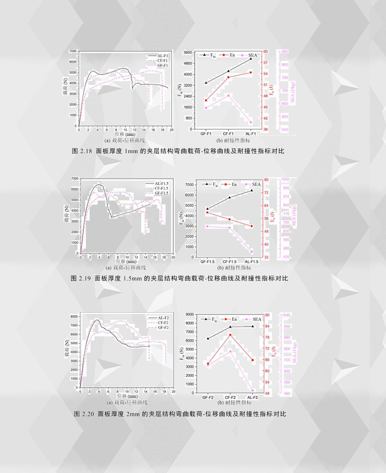 2.4.1面板對結(jié)構(gòu)耐撞性能影響——F為了研究面板材料在彎曲工況下對夾層結(jié)構(gòu)力學(xué)性能的影響,比較了同一厚度下不同面板材料的夾層結(jié)構(gòu)的載荷-位移曲線,如圖2.18(a)所示,結(jié)合壓潰失效過程分析,對面板為1mm的試件而言,試件GF-F1、CF-F1和AL-F1的臨界失效模式均為壓痕壓入(IN),但纖維增強(qiáng)夾層結(jié)構(gòu)與鋁合金夾層結(jié)構(gòu)不同的是,由于纖維復(fù)合材料不像鋁合金那樣有明顯的塑性變形,試件達(dá)到臨界失效時(shí),前者的面板發(fā)生了彈性變形,后者發(fā)生塑性變形,前者載荷達(dá)到臨界載荷時(shí)會繼續(xù)增大,只是增加幅度有所減小,而后者載荷會減小。試件GF-F1在斷裂之前,未出現(xiàn)明顯的芯層剪切裂紋且未出現(xiàn)載荷下降;CF-F1后屈曲過程出現(xiàn)芯層剪切裂紋(彎曲位移約8mm處),而AL-F1后屈曲過程中出現(xiàn)界面失效和剪切裂紋(彎曲位移約10mm處),從載荷-位移曲線中可以看出在這兩處失效時(shí),后者的載荷下降速度更快。