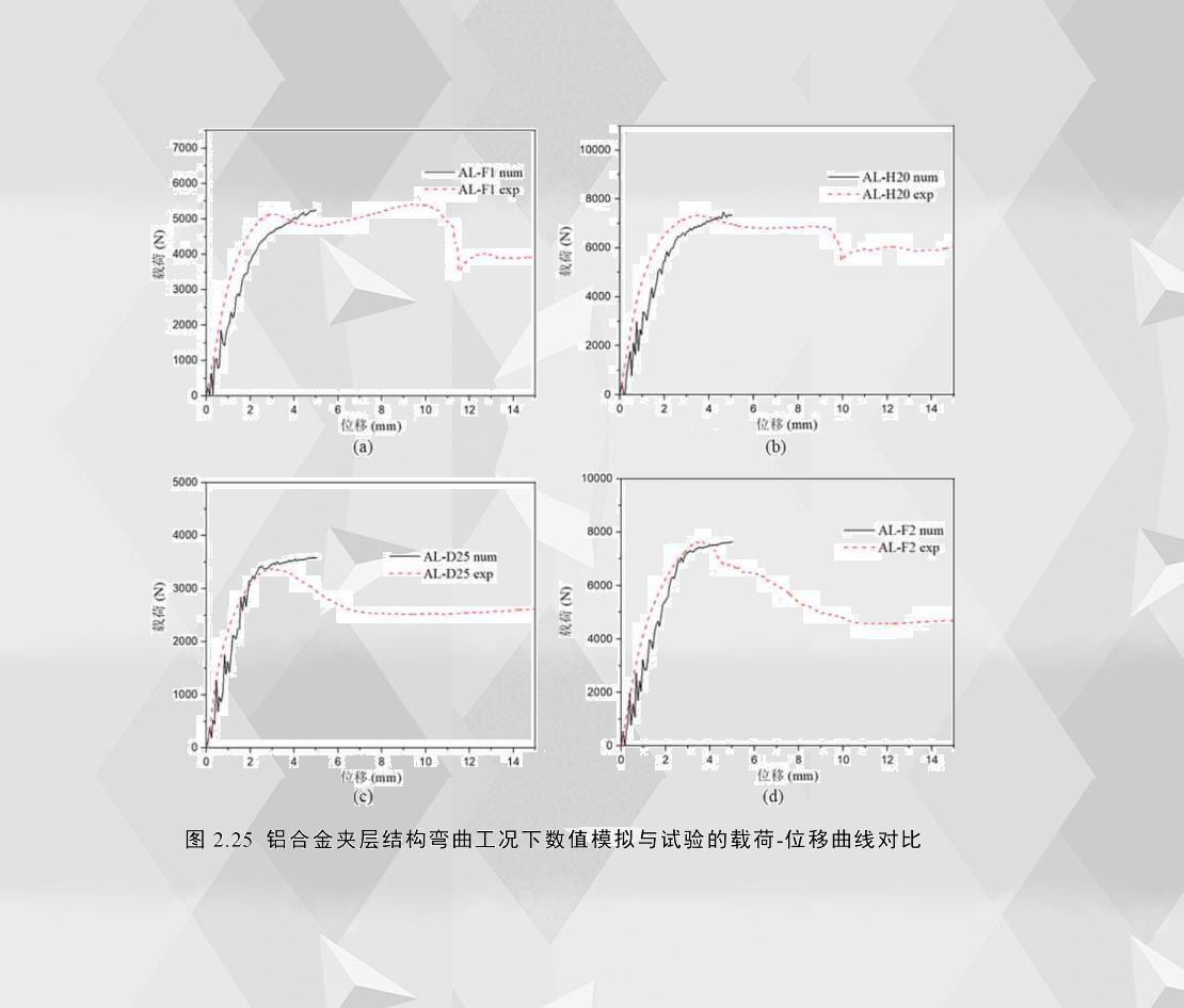 圖2.25展示了四種試件在彎曲位移0至5mm的數(shù)值模擬載荷-位移曲線及其相應(yīng)的實(shí)驗(yàn)曲線,其中(a)和(b)的臨界失效模式為壓痕壓入(IN),(c)和(d)為芯層剪切(CS),圖中曲線均為原始數(shù)據(jù),未作濾波處理。