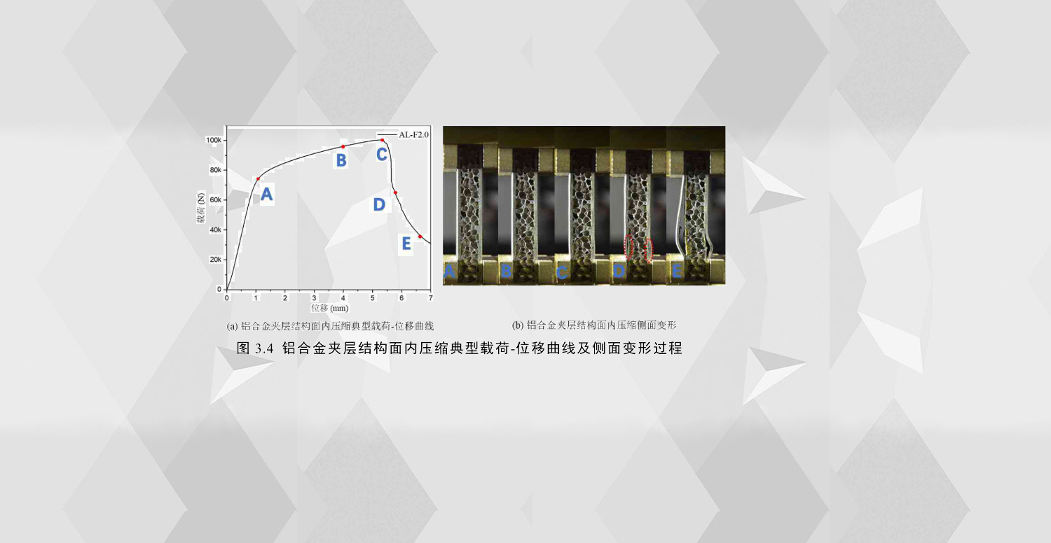 3.4(a)描繪了鋁合金夾層結構在面內壓縮下典型載荷-位移曲線,其壓潰過程大體可以分為三個階段,O-A彈性階段,此階段結構處于彈性變形,載荷與位移的關系為線性增長;A-C塑性階段,在此階段結構面板受到較大的壓力而產生塑性變形,載荷與位移仍近似呈線性增長趨勢,只是載荷增長幅度遠小于彈性階段增長幅度;C之后屬于后屈曲階段,由于在此階段面板發生嚴重屈曲變形,并且面板與芯層之間的膠層出現大面積失效,這導致夾層結構的承載能力大大降低,此外,由于泡沫芯層壓縮的效果,在面板失穩之后夾層結構仍有較弱的承載能力,并未完全失去承載能力,圖3.4(b)為此試件在圖3.4(a)各點時刻側面面板與芯層泡沫的變形圖。